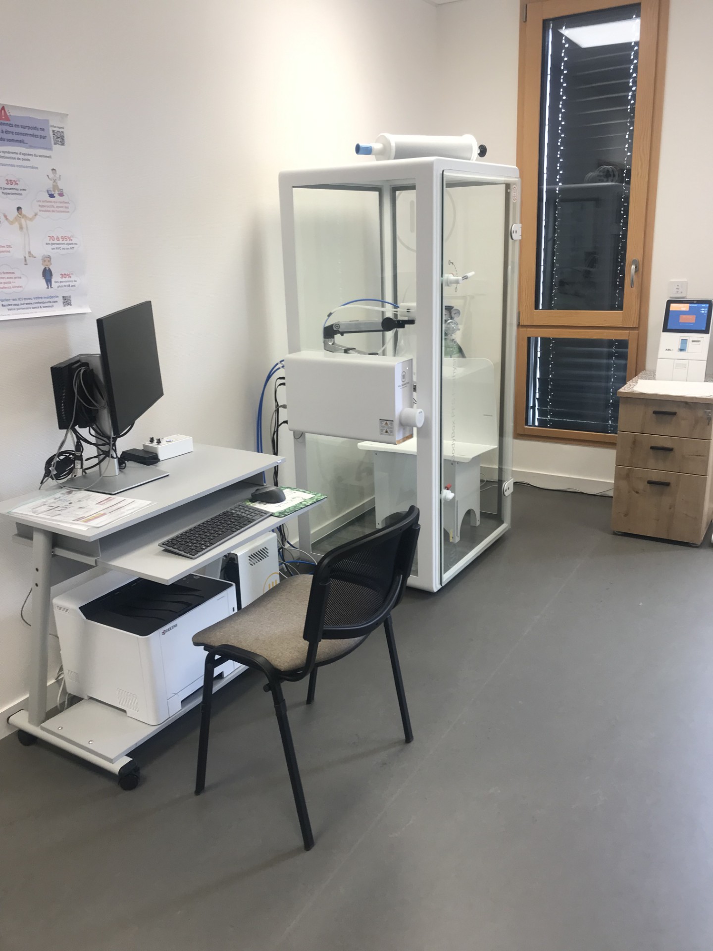 Les EFR sont les explorations fonctionnelles respiratoires, elles se réalisent dans une cabine de pléthysmographie présente dans le cabinet et qui permet la mesure des volumes respiratoires ainsi que l’évaluation des capacités respiratoires du patient.